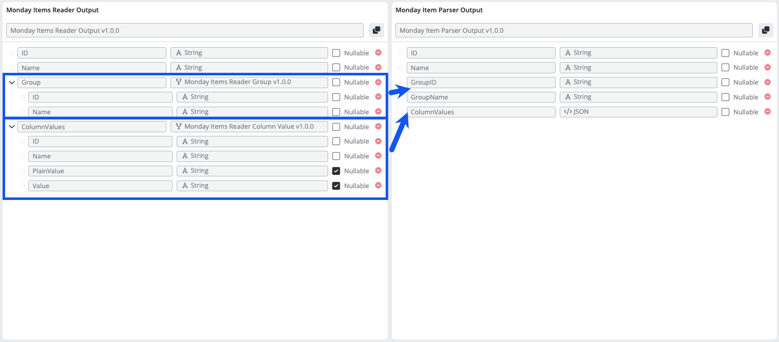 Comparison of the output schemas of the two connectors: Monday item reader and the simplified Monday Item Parser.