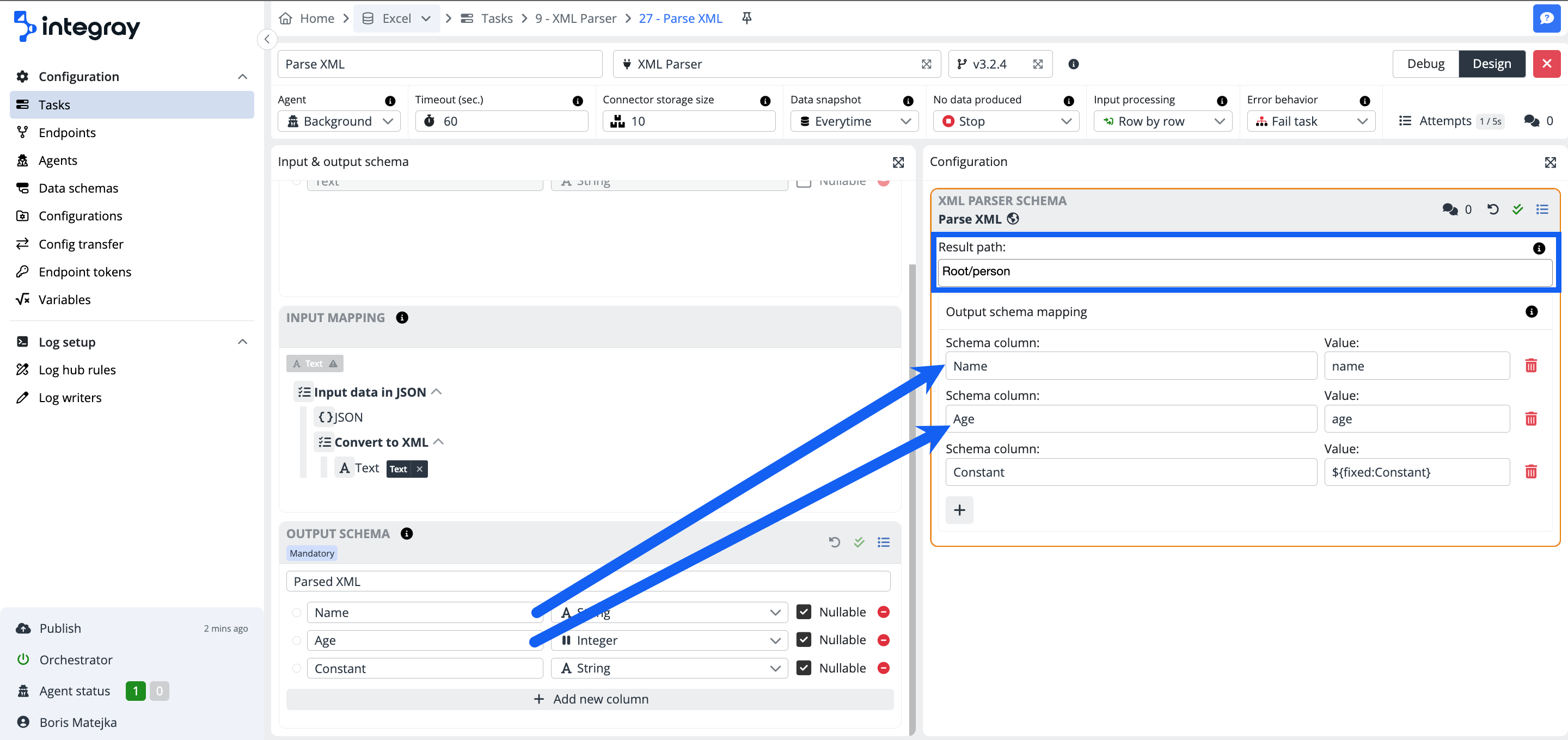 If your output schema structure differs from the XML structure, you have to configure the output schema mapping. You have to specify an XPath for each field of the used output schema