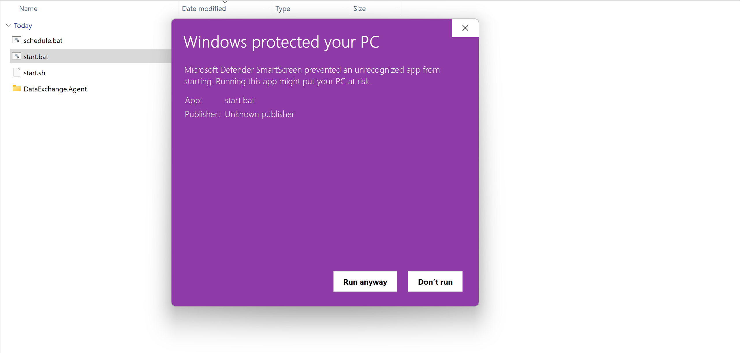 On Windows double-click the start.bat file to run the agent or run the scheduler. After clicking the file, a modal window titled "Windows protected your PC" may appear. To proceed, first click More info and then confirm by clicking Run anyway.