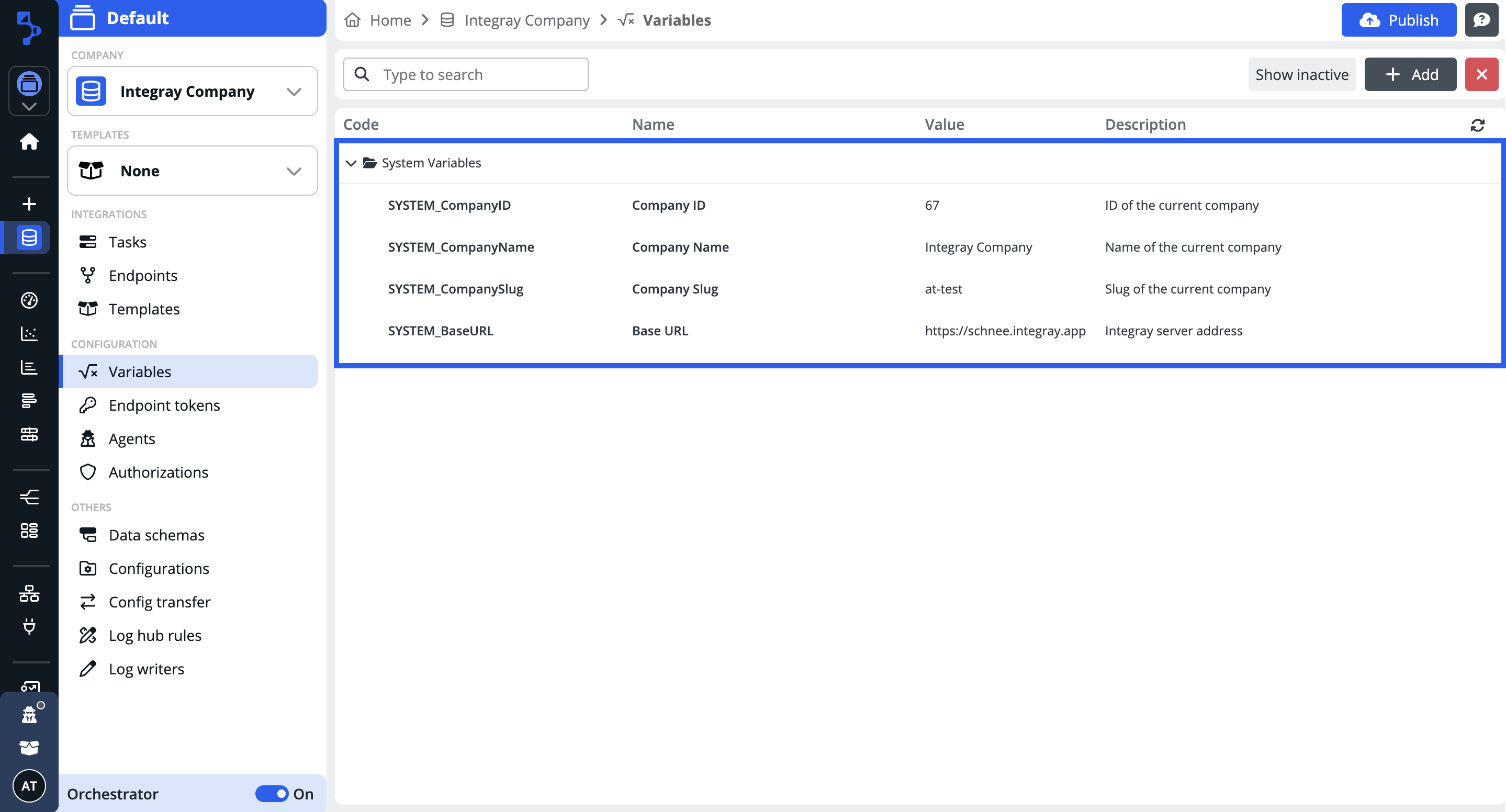 The System variables feature introduces a set of predefined variables that you can use across your Integray environment. These variables provide direct access to essential company-related information, making referencing key values in scripts, configurations, and API calls easier.